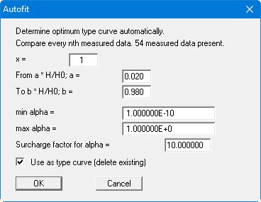 In the dialog box you can specify which nth data points of the data curve are considered for "Autofit 2". Here, once again, you can limit the range of H/H0. Moreover, you can define a minimum and a maximum type curve parameter, between which the type curve parameter varies. You must also specify a surcharge factor for the type curve parameter. Do not make this factor too small at first, or go for a coffee afterwards.....