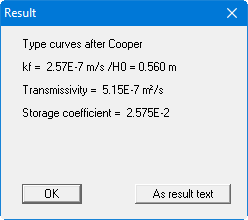 In the first line you are reminded of the selected evaluation model. Below this are kf and the user-defined H0, the transmissivity and the storage coefficient once again. Close this info box with "OK". If you would like to transfer the results to your output sheet , click the "As result text" button. The results are then displayed in the lower right box of the output sheet (also see the "Edit/Result text" menu item).
