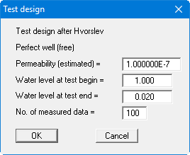 After selecting this item a "Test design after Hvorslev" dialog box opens. The same configuration (Case A/B) appears that you previously selected in the menu item "Hvorslev/- preferences".