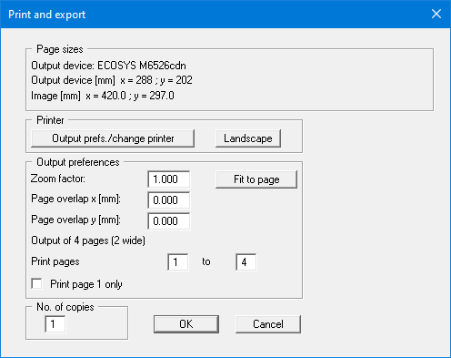 Alternatively, you also have the possibility of selecting a smaller zoom factor, ensuring output to one page ("Fit to page" button). Following this, you can enlarge to the original format on a copying machine, to ensure true scaling. You can also print only the 1st page with zoom factor = 1.0, in which case the bottom left-hand area is printed. Furthermore, you may enter the number of copies to be printed.