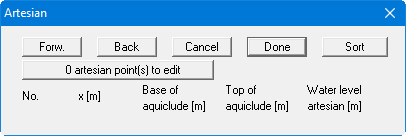 If you enter an artesian, you can thus consider confined groundwater systems. For input, select the "Artesian" button and enter the number of polygon points for the confined aquiclude in accordance with the previous description. Then, you must enter the x coordinates of the confined aquifer and the corresponding values for base and top of aquiclude and the water level below the base of the aquiclude.