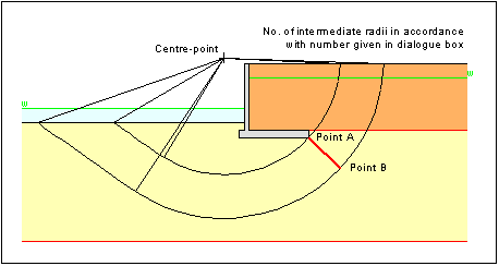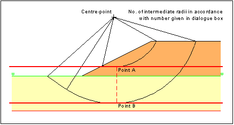 For "Variation of slip circle radii" the search grid is characterised by two points A and B, which must be clicked by the mouse. There are four different types of definition: