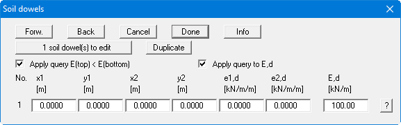 e1,d and e2,d are design values from the new standard and describe the magnitude of the axial forces in kN/m/m. E,d is the design force that can be accepted by the soil dowel. If the "Apply query to E,d" check box is activated, the computed dowel force cannot become larger than E,d (see also "Info" button).