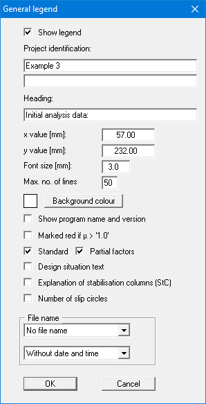 Any description previously entered using the menu item "Editor 1/Project identification" is used in the above dialog box. In addition to the project identification it is also possible to enter a heading for the general legend here. Activate the corresponding check boxes to also display the adopted standards and the partial factors. The further explanations are adapted to your settings in each case, for example, explanation StS for stabilisation. The number of slip circles can be entered for the slip circle method.