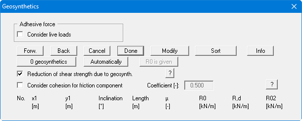 If the "Geosynthetics via company products" check box is not activated in the "Editor 1/Analysis options" dialog box, the following dialog box opens after clicking the "Geosynthetics" button in the central dialog box. The "Info" button provides additional information on the forces involved.