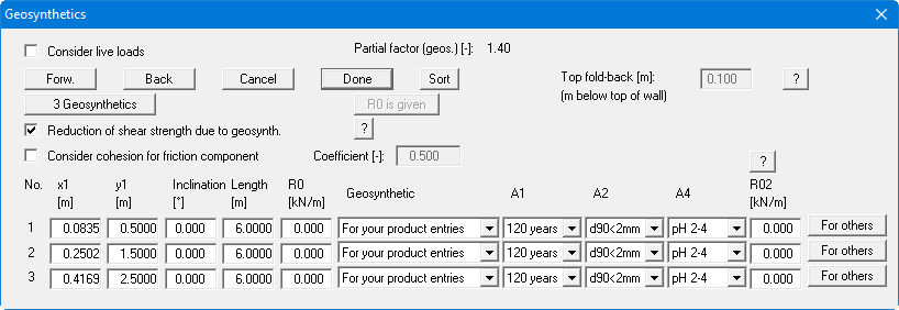 The required company product can then be selected for each of the geosynthetics. The coefficients defined for a geosynthetics, the length and the inclination can be adopted for the remaining geosynthetics by using the "For others" button.