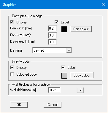The appearance of the earth pressure wedge and the gravity body can be edited. This menu item cannot be selected if more than 1 nailed slope face exists in the system.