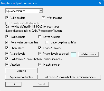 Use the "System coloured" combo box to activate coloured system visualisation, i.e. the soil colours defined in "Editor 1/Soil properties" are adopted for use in the soil properties legend and in system visualisation. It is also possible to define hatching for the various soil types, or turn off colour and hatching completely.