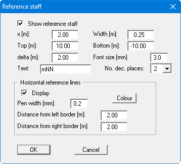 The position of the reference staff is entered as the distance from the left page margin in "x[m]". The height range in y-direction is given as "Top [m]" and "Bottom [m]". All values are in metres in the scale selected (see menu items in the "Page size + margins" menu).