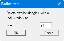 The radius ratio describes the relationship between exterior radius and interior radius of a triangle. For an equilateral triangle this ratio equals 2.0 (optimum). Before you arrive at the dialog box above, the maximum and the average radius ratio of the mesh appear. In the example above, all exterior triangles with a radius ratio larger than 21 will be removed.