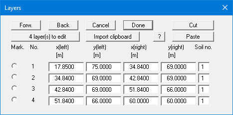 The dialog box for the soil layers has two additional buttons in comparison to the corresponding boxes for surface points and soil properties