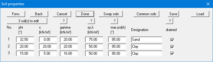 For each soil information on friction angle, cohesion, unit weight and pore water pressure coefficient are needed.