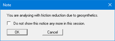 If the slip surface coincides with the geosynthetics, the tangent of the friction angle is multiplied by the geosynthetics reduction factor µ and correspondingly adopted for analysis. After confirming the note the following dialog box opens: