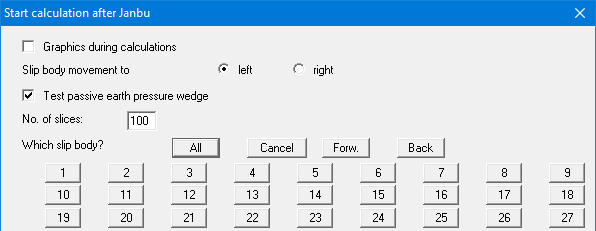 Adjust the number of slices to suit your wishes. If the "Test passive earth pressure wedge" check box is activated, the program will examine whether gradients greater than 45° - /2 occur in the passive earth pressure region of the respective slip body. These slip bodies will not be investigated. Slip body movement should to the "left". Begin calculation of all slip bodies using the "All" button. Once calculations are complete you will be shown some statistics.