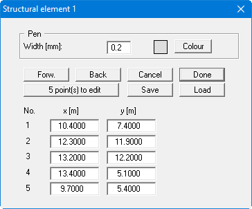 Using the "x point(s) to edit" button, define the number of polygon course points and enter the coordinates for the individual points. You do not need to close the polygon; the program does this automatically. The pen width and colour of the structural element can be edited at the top of the dialog box.