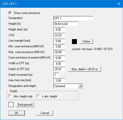 With "Height" and "x" you enter the position of the cone penetration test (CPT). Here, you can also enter a "Height displacement" (see "Input/Stratigraphic log", "Base data" dialog box). "Line strength" designated the width with which the curve is drawn. With the "Colour" button you can alter the pen colour.
