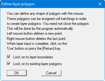 If you lock on to layer boundaries when defining layer polygons, the program automatically adopts the code number for the polygon fill (i.e. colour and soil signature) from the soil layer lying above the last polygon point. The last point should therefore lock on to a layer boundary. The last code number setting is adopted as the default for the next defined polygon unless you lock on to a different layer boundary again.