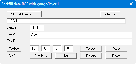 Using the "Interpret" button the SEP 2 abbreviations can be used in the same way to automatically enter the long texts allocated to the abbreviations. However, only codes from the "Petrography" abbreviations range may be used. Here, too, the texts can be allocated to text lines TextA and TextB by separating the petrographic abbreviations with a semicolon. Additional information on the SEP 2 abbreviations can be found in Section “Layer input using SEP 2 abbreviations (recommended)“.