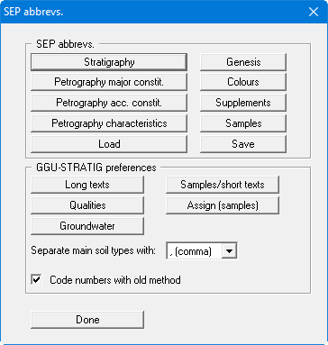 The menu item "Abbreviations (SEP)" opens a dialog box with the "SEP abbrevs." group box for editing abbreviations. The presentation of the texts interpreted using the SEP 2 abbreviations can be modified in the "GGU-STRATIG preferences" group box (see Section below).
