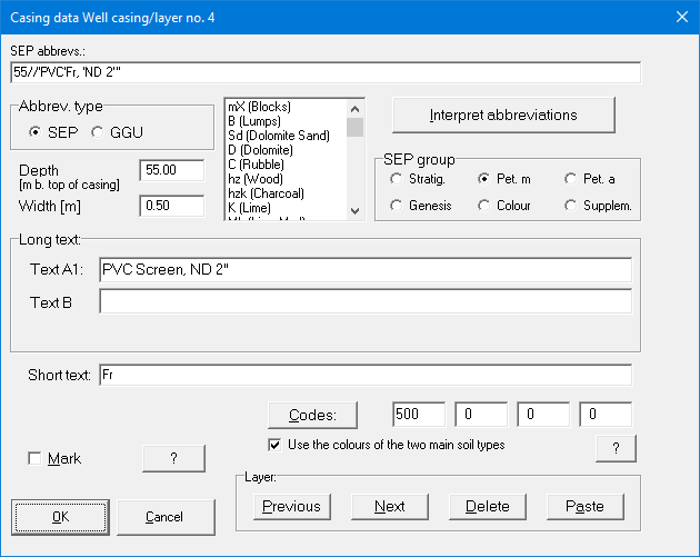 For well casings, the following pre-defined hatchings are available with the given code numbers: