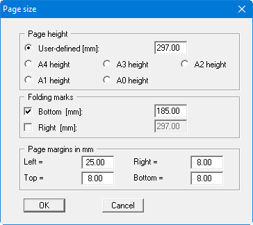 This menu item allows you to adjust the height of the output sheet and the format of fold markers and page margins. The page width is defined via the menu item "Input/Overall view". The following dialog box opens: