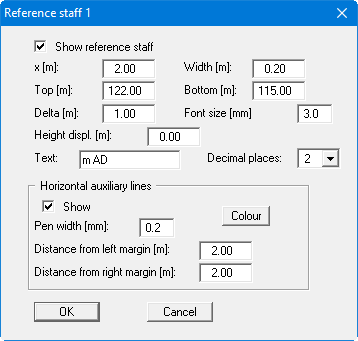 All input in the dialog box is in [m] of the user-defined scale (see Section "Input/Overall view"). The reference staff format, position, size and labelling can be adapted to suit user requirements. The position of the staff gauge can also be edited using the menu items "Input/Move object" and "Input/Move all objects".