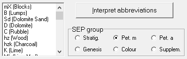 The available abbreviations are displayed in the layer input editor box if the required range is selected in "SEP group". An abbreviation is copied from the list to the end of the abbreviation line by double-clicking.