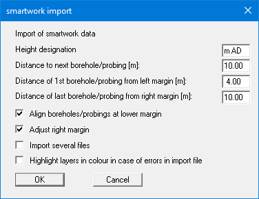 Here you can enter the height designation and define the distances between the individual boreholes and probings as well as the distances to the left and right margins. So that you do not have to define the lower margin for each borehole yourself, you should always activate the "Align boreholes/probings to lower margin" check box. If you have entered several boreholes in one file, have the right margin adjusted. The program automatically extends the right margin so that all boreholes are visible.
