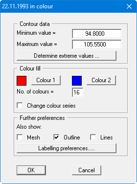 In addition to the colour presentation you can also have the triangle mesh and/or the outline displayed. Additional contour lines can also be drawn. Line labelling preferences can be defined by means of the "Labelling preferences" button."OK"