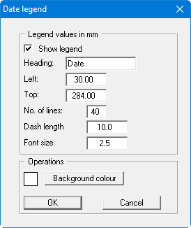A text can be specified as legend header. You can define and edit the position of the legend using the values "x" and "y". You control the size of the legend using "No. of lines", "Dash length" and "Font size"; where necessary, several columns are used. The fastest way to modify the position of the legend is to press the [F11] function key and then to pull the legend to the new position with the left mouse button pressed. The legend can be provided with a coloured background fill; the colour can be edited via the "Background colour" button.