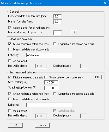 In the "Measured data axis" group box you can define horizontal reference lines, measured data axis font size, markers preferences, etc. It is also possible to define a logarithmic measured data axis or to visualise the hydrographs as a bar chart, e.g. to visualise precipitation data. The measured data axis can also be labelled in this menu item's dialog box.