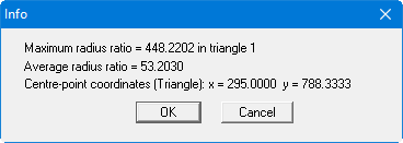 The program first computes the maximum and average radius ratios of the most unfavourable triangle. The radius ratio describes the relationship between external radius and internal radius of a triangle. For an isosceles triangle, this ratio equals 2.0 (optimum).