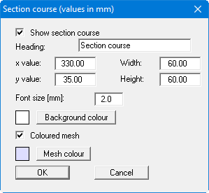 The position of the legend can be defined and edited using the values "x" and "y", "Width" and "Height". You can edit the font size of the entered heading and the colour of the background. The triangular mesh in the sketch can be provided with a coloured background. The colour can be edited using the "Mesh colour" button if the "Coloured mesh" check box is activated.