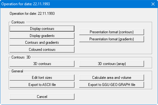 After selecting the required date the following dialog box opens allowing the type of contour visualisation to be specified, preferences for visualisation in general or the data to be output for other applications.