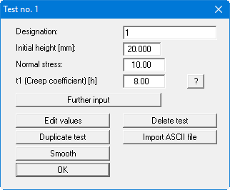 Enter the designation, initial height (mm), normal stress and the creep coefficient of the single test in this box.