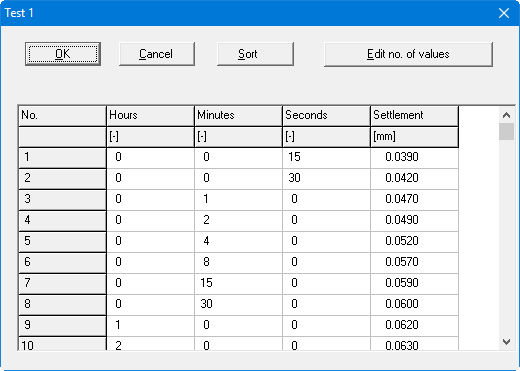 In the example used here 12 data pairs have already been entered. The number of measured values can be edited by clicking the "Edit no. of values" button. The values are sorted according to time by pressing the "Sort" button. If irrelevant intermediate data needs to be deleted, change the time to a very large value so that the record is moved to the end. Subsequent reduction of the number of values then deletes this record from the list.