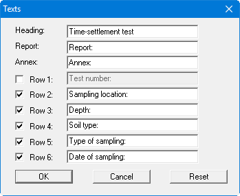 A dialog box opens after pressing the "Diagram texts" button, allowing the x- and y-axes labelling for the time-settlement diagram to be edited. Here, too, the default labelling can be restored using the "Reset" button.
