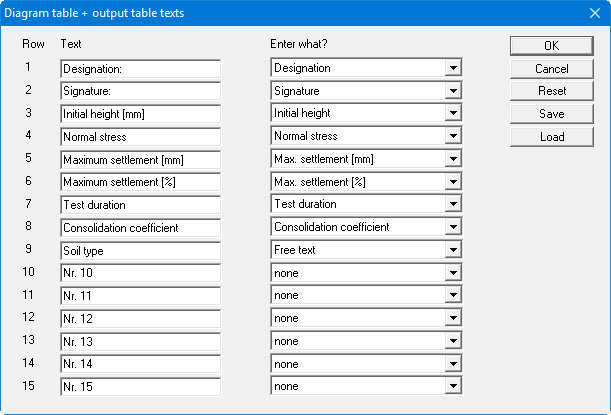 In the "Text" boxes a text must be entered by hand which is later used as a description. After clicking the arrows in the "Enter what?" column the values or text in the drop-down list entered or determined by the program can be allocated to the to the rows of the diagram table. Rows with a "None" allocation are not displayed.