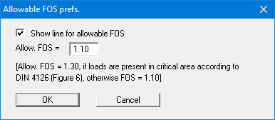 DIN 4126 demands a FOS of 1.1 or 1.3 (if loads from structures act in the critical area). If you are analysing using the global safety factor concept, you can have the user-defined safety factor entered as a horizontal boundary line into the safety factor distribution diagram. Use this menu item to do this.