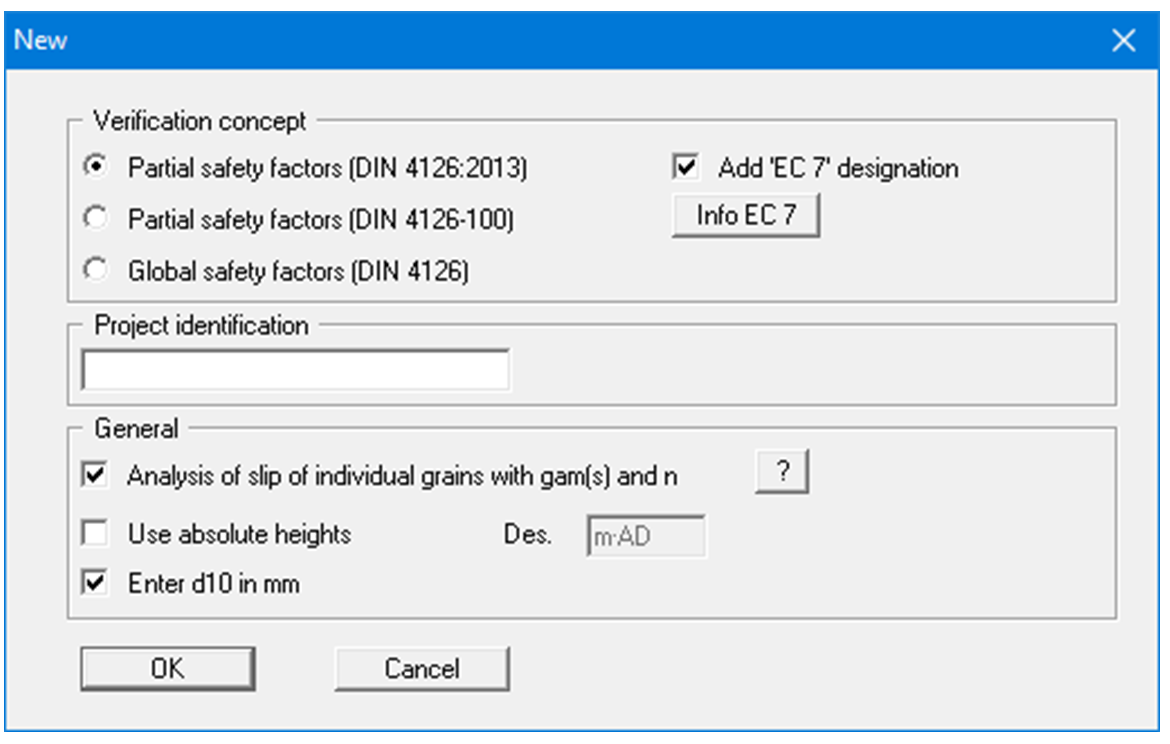 You decide whether the necessary verifications are to be performed using the partial safety factors to DIN 4126:2013, or using the global safety factors to the old DIN 4126. In order to guarantee the compatibility of the older records it is still possible to select DIN 4126-100 here. Eurocode 7 with national annex 'DIN 1054:2010' refers to the DIN 4126:2013. For the sake of formality, the expression 'DIN 4126' can be prefixed by 'EC 7' when printing. Just activate the "Add 'EC 7' designation" check box. You can enter a project identification, which will subsequently be entered in the General legend.