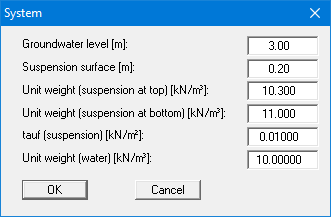 Using this menu item, information is entered on the unit weight of the suspension, the suspension surface level, the liquid limit of the slurry fluid (tauf ) and the groundwater level.