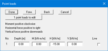 The direction of the forces is defined by means of the sign. In the example above a horizontal force of 15 kN/m has been entered at the top of the wall, acting towards the left. When analysing with the new partial safety factors you will also see the "Live" check box because of the differentiation between permanent and changeable loads.