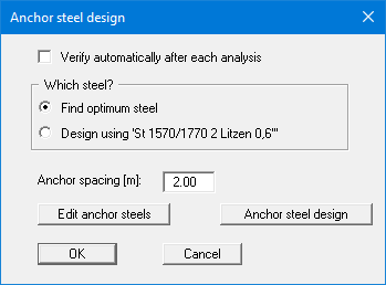 Using this menu item, you can specify preferences for designing the anchor steel and then carry out the design for an analysed system by means of the "Anchor steel design" button. If you activate the "Verify automatically after each analysis" check box, you will be automatically presented with a query for anchor steel design when analysis is complete.