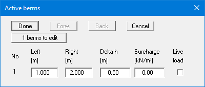 Enter the x-ordinates of the toe and head of the berm. With "delta h" you define the height of the berm; whereby negative values are also permitted. Finally, a "Surcharge" on the horizontal surface behind the head of the berm can be entered.
