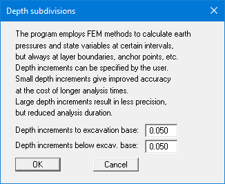 GGU-UNDERPIN uses the finite element method, which requires the system to be divided into a number of finite elements (rods). You can specify the size of these depth increments for the region above and below the excavation base.