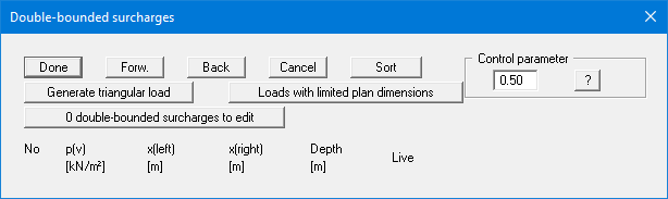 The number of surcharges can be edited using the "x double-bounded surcharges to edit" button. Then enter the size of the surcharges, the ordinates and the depth in metres from the top of the wall or as absolute heights.