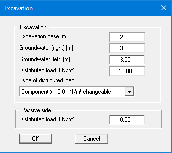 Moreover, a distributed load can be defined. Using the global safety factors, you will see here the "Distributed load as live load" check box. This is only of interest for verification of deep-seated stability. If the distributed load is defined as a live load, this load will only be adopted for verification of deep-seated stability if it acts excitingly. Additionally, you can define a distributed load on the passive side.