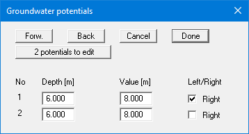 In the above example, potentials of 8.0 m have been entered for 6.0 m below the top of the wall on either side. Additional potentials are only taken into consideration if you selected the water pressure approach using flow conduits.