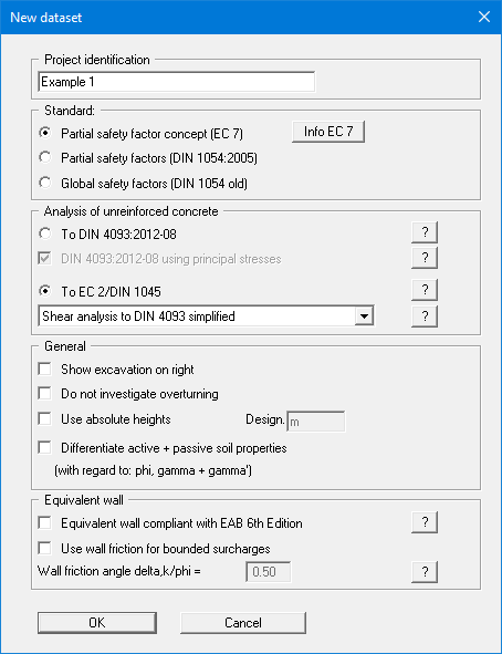 If you select the "Use absolute heights" check box you can enter all depths or heights in m AD (heights are positive upwards). If you leave this box unselected, the top of the wall is assumed at 0.0 (height/depth) and all input of layer depths etc. is positive downwards. If, however, you want to work with absolute heights, enter the appropriate depths correspondingly altered. Thanks to WYSIWYG there is no danger of using incorrect data, as all input is immediately visible on the screen. In this example the check box "Use absolute heights" is not selected.