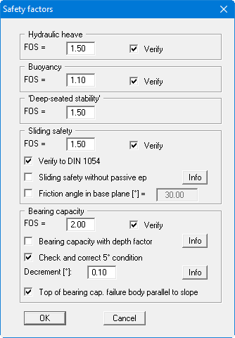 Then enter the safety factors for the individual verifications. The program's default values in the box are those required by the EAB. If you do not want the program to perform the verifications, the corresponding check box must be deactivated. Pressing the two "Info" buttons, you will see further information.